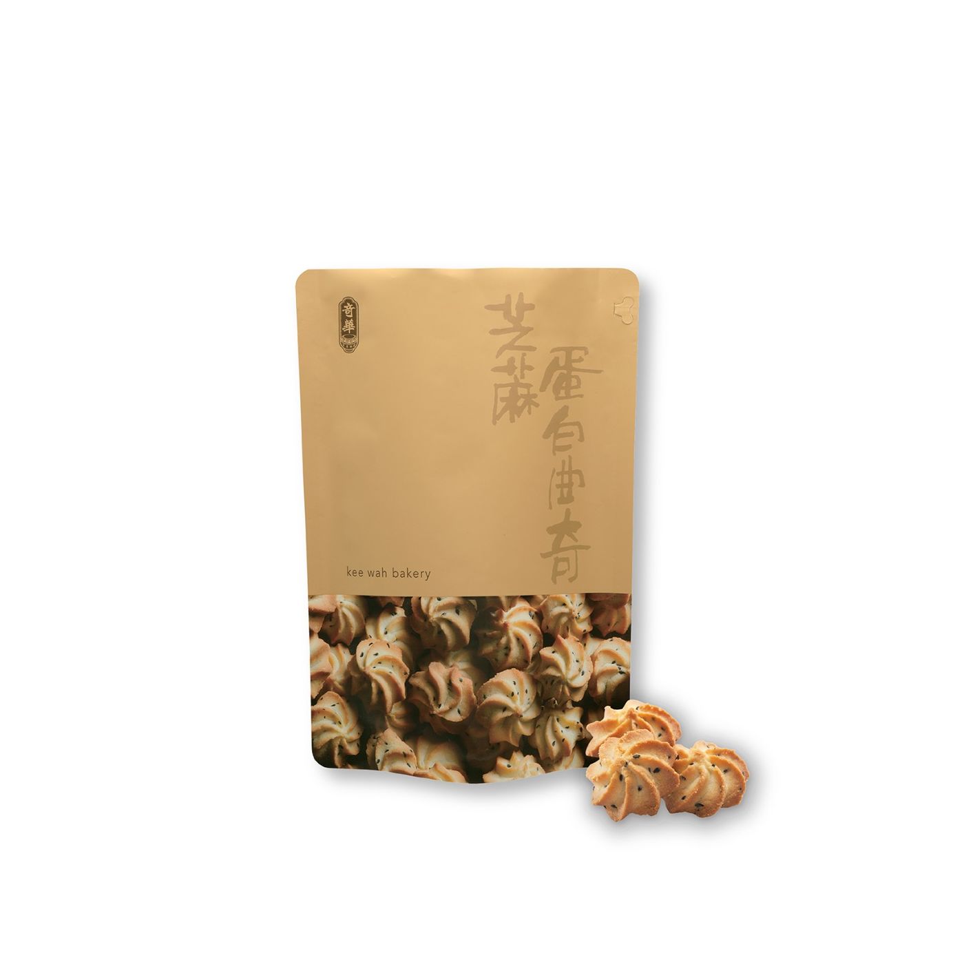 黑芝麻蛋白曲奇以蛋白制成,令曲奇的口感更加丰富细腻;经烘焙后的曲奇外形更呈现出金黄透白的独特质感。