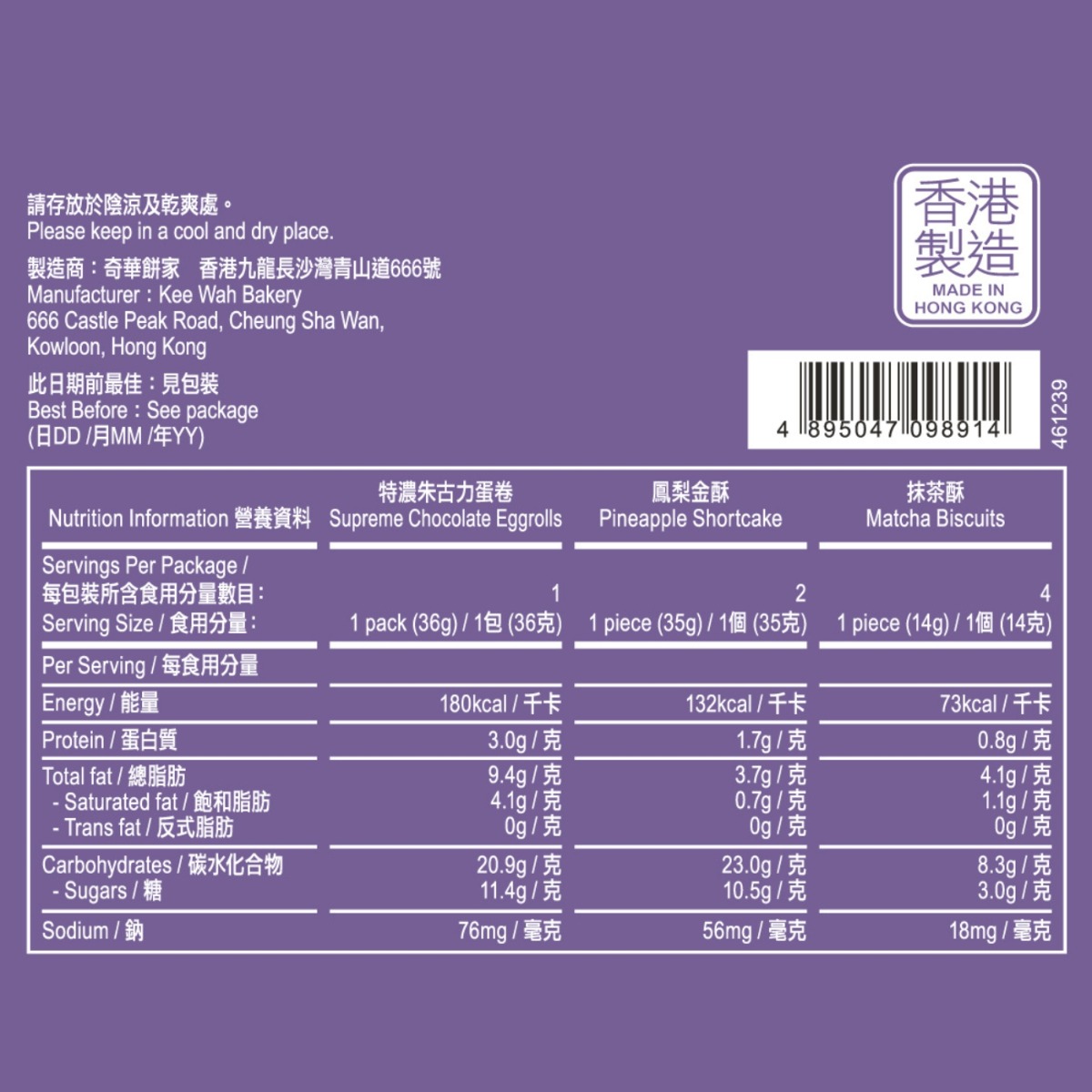 1. 鳳梨金酥 2件 2. 抹茶酥 4件 3. 特濃朱古力蛋卷 (6支裝) 1包 |